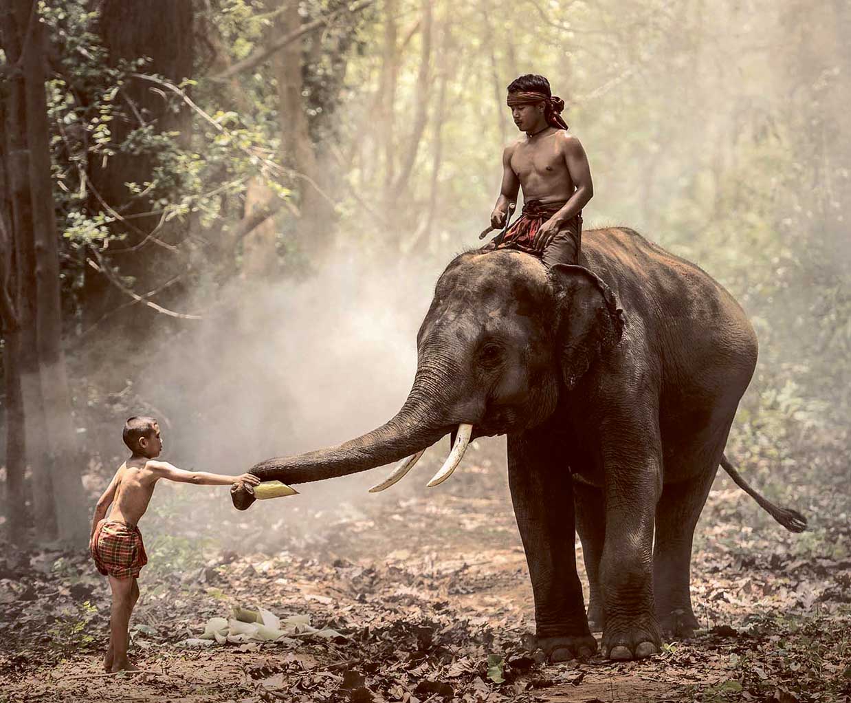 A young boy stands reaching out to feed an elephant while another boy sits calmly atop the elephant in a misty forest
