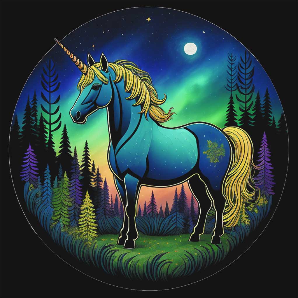 Blue unicorn with golden mane in a glowing forest under a moonlit sky and aurora lights