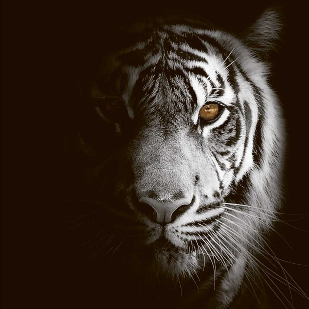 Half-lit white tiger portrait with piercing amber eye emerging from deep shadows
