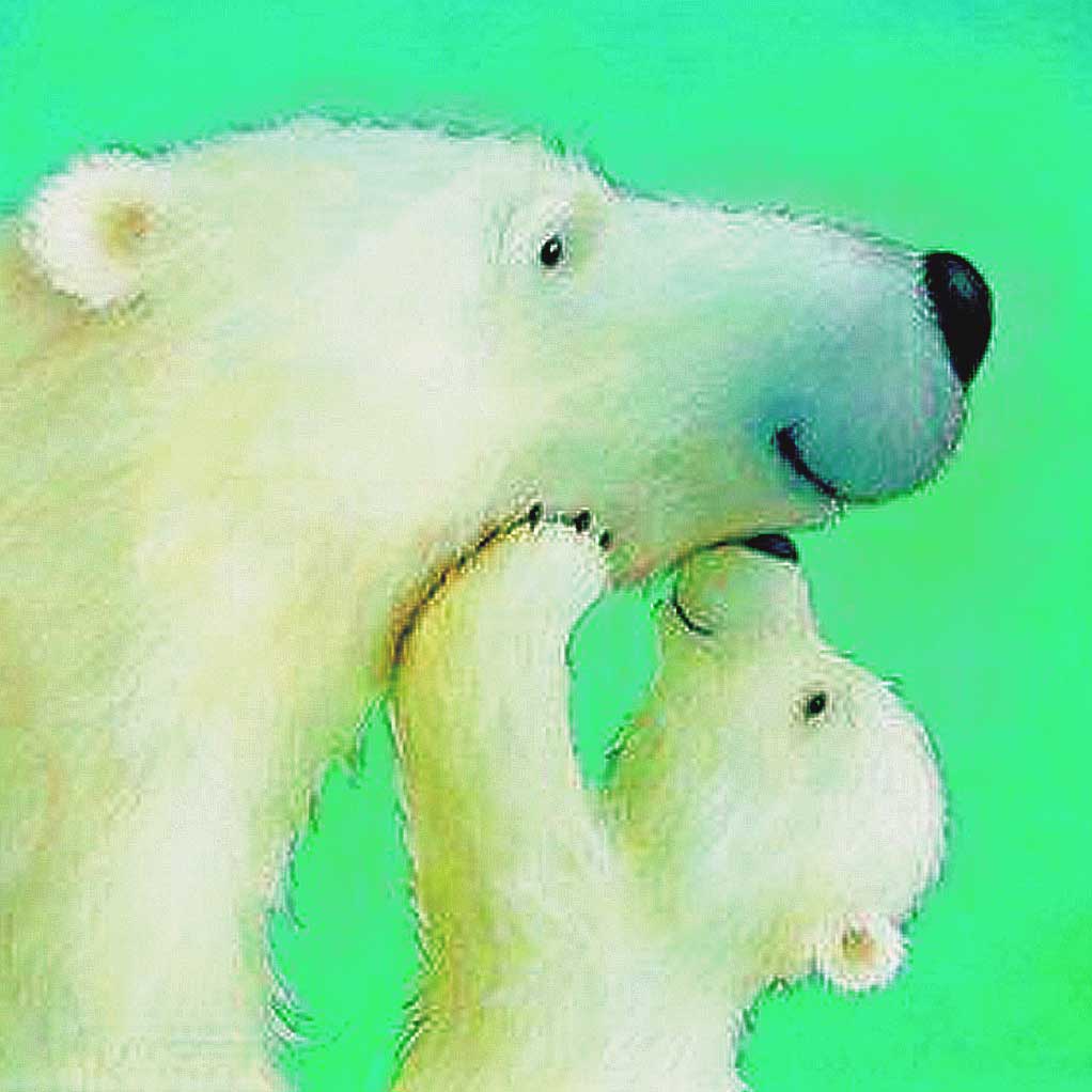 A heartwarming image of a polar bear and her cub sharing a tender moment, with a soft green background highlighting their affectionate bond.