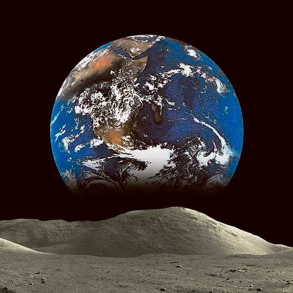 Earth floating above the moon's surface, offering a surreal view of the planet from space with a detailed lunar landscape.