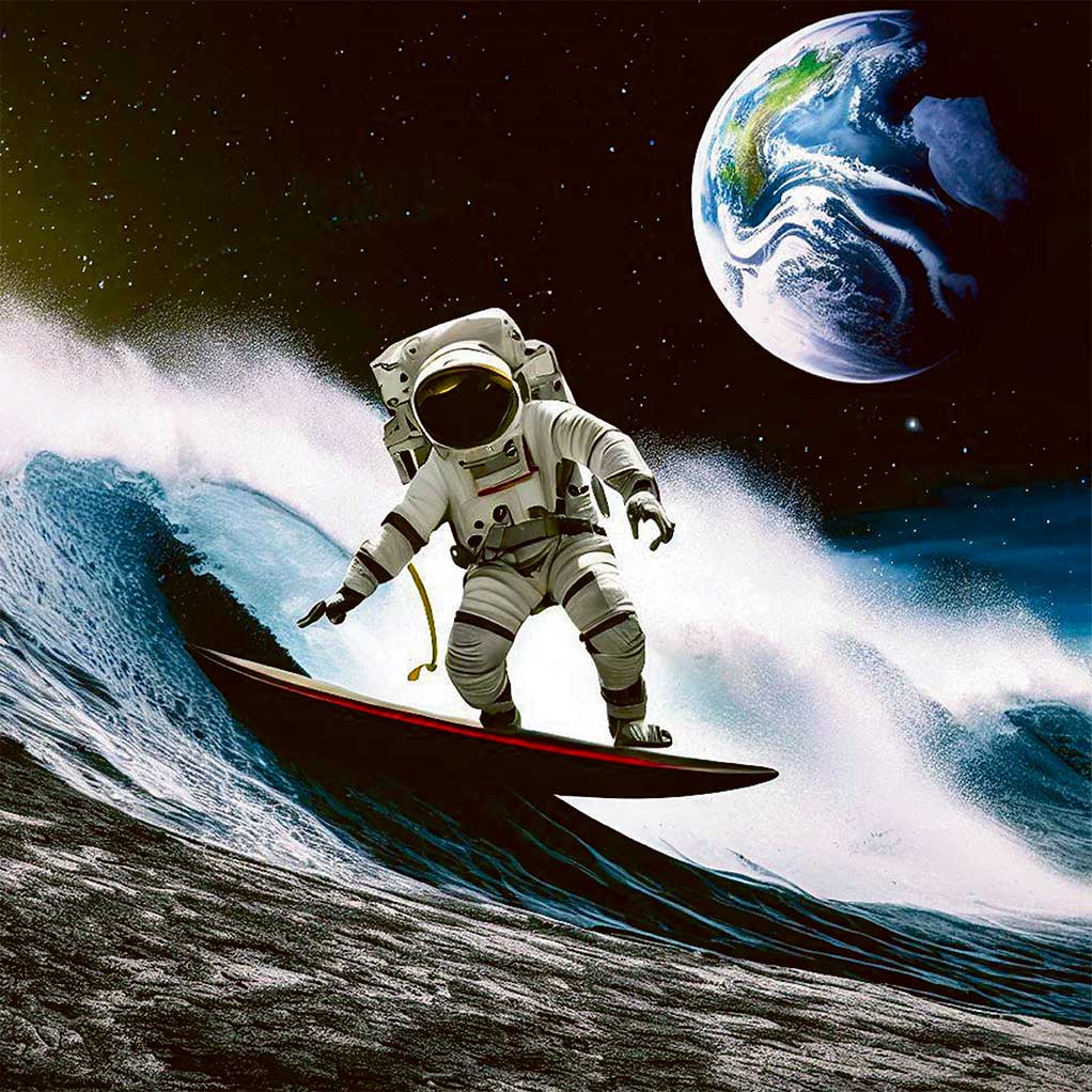 An astronaut surfing a wave in space with Earth in the background, combining space exploration and the thrill of surfing in a surreal cosmic scene.