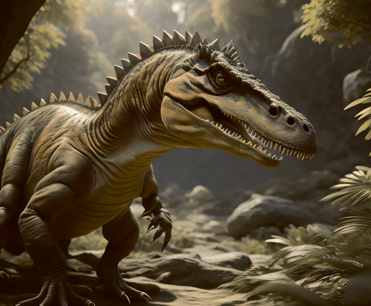 Realistic dinosaur with ridged spine and sharp teeth standing in lush jungle environment