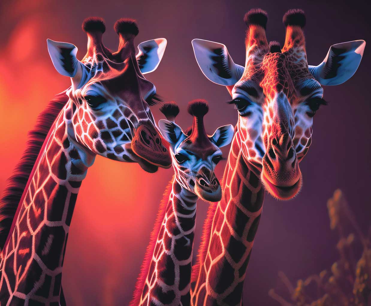 Three giraffes standing together in a vibrant sunset background.
