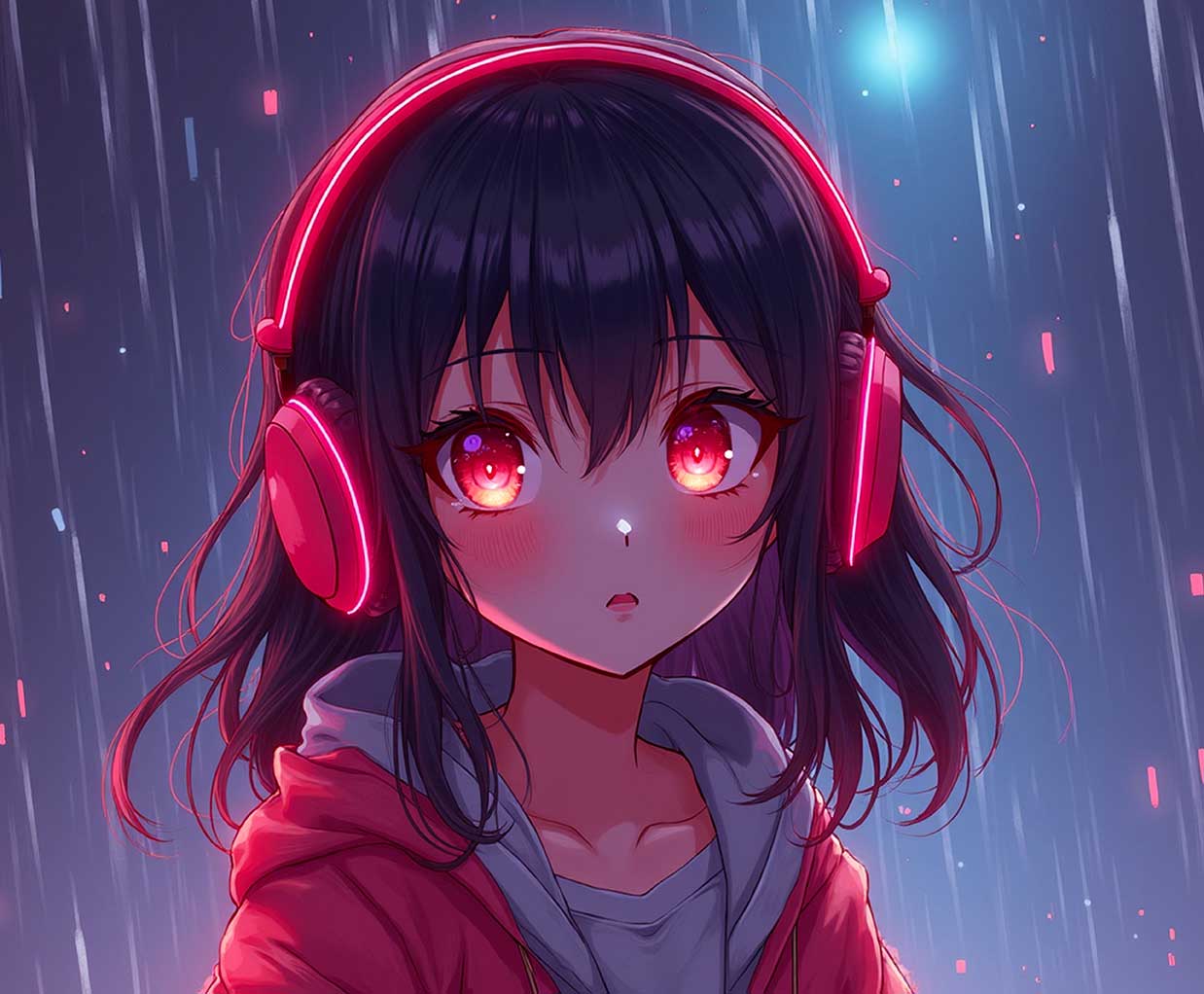 Anime girl with glowing red headphones standing in the rain looking up