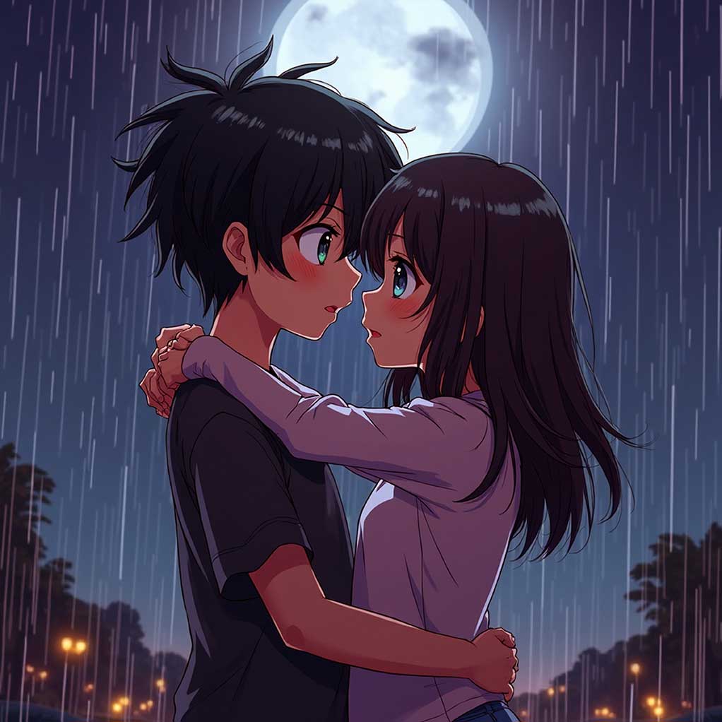 Anime couple sharing a romantic hug in the rain under a moonlit sky
