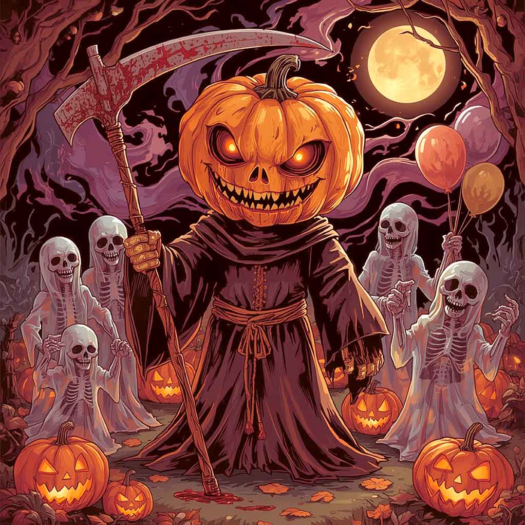 This unique piece showcases a Halloween Skeleton, surrounded by carved pumpkins, illuminated with vibrant LED lighting.