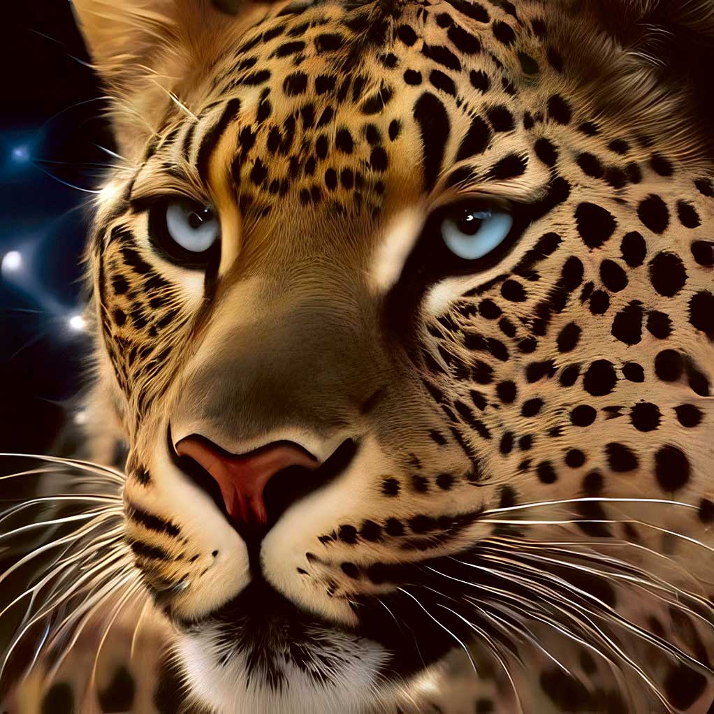 Close-up of a stunning leopard with striking blue eyes, showcased in a customizable LED Box Frame for unique and vibrant home decor.