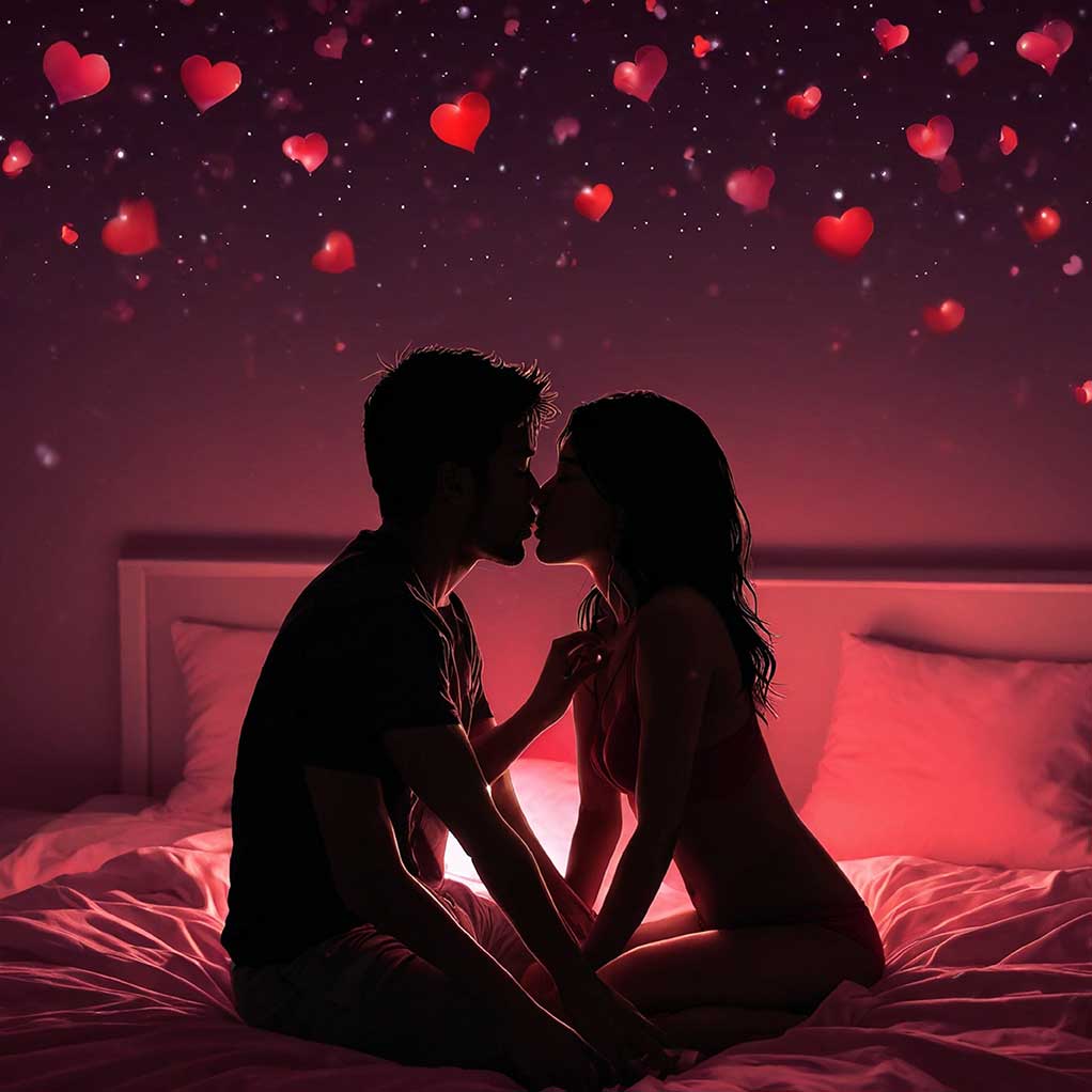 Romantic couple sharing a kiss with floating heart-shaped lights, captured in a customizable LED Box Frame with eco-friendly lighting.