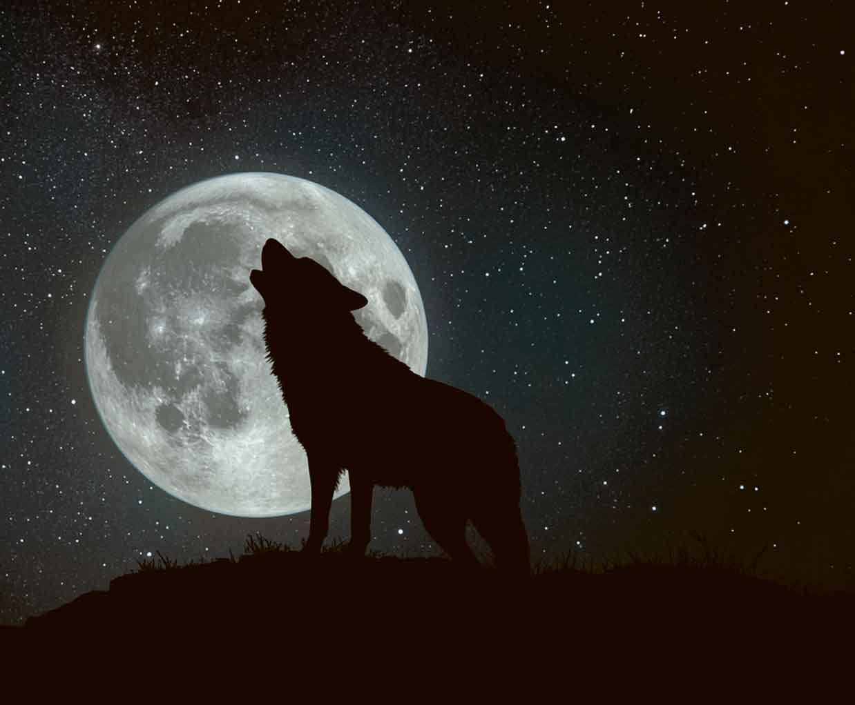 The image features a silhouette of a wolf howling at the moon. It is set against a night sky filled with stars, creating an atmospheric and serene scene that highlights the beauty of nature and the cosmos. The wolf, an animal known for its vocalizations, draws attention to the astronomical object above it.